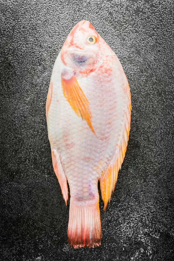 A clean, premium layout showcasing Nile Tilapia fillets, goat meat cuts, and fresh eggs.